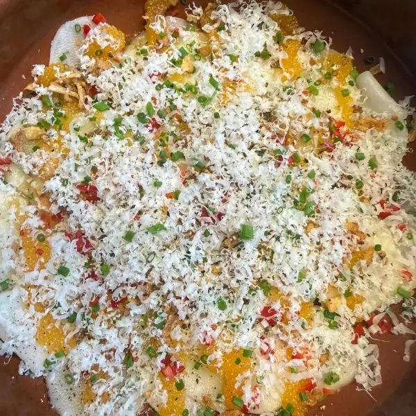 - Picklad potatiscarpaccio med löjrom, friterad lök, chili & dill